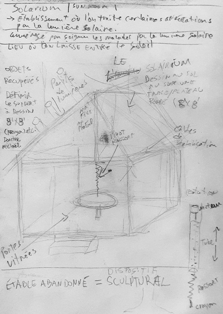 Le Solargraphe-2 s’active grâce à un capteur solaire qui communique directement à son mécanisme dessinateur. Aucun microcontrôleur n’est utilisé. Il s’agit d’une communication directe entre les cellules solaires vers des contrôles de vitesse (potentiomètres) destinés à trois moteurs indépendants. Ceux-ci servent à calibrer l’appareillage et à définir les paramètres de sensibilité de la machine à dessiner. Un premier moteur installé au plafond est relié grâce à un long câble d’acier souple à un curseur sur lequel repose le moteur dessinateur équipé d’un bout de fusain. Un second moteur relié à un mécanisme à courroie est placée sous la table afin d’activer ce curseur. Activés par l’intensité d’ensoleillement, ces moteurs s’activent aléatoirement et permettent à un morceau de fusain mobile de valser sur une table à dessin légère qui pivote aux moindres mouvements du fusain qui effleure le papier. Ce marqueur sensible, par moment presque silencieux, versus des épisodes d’hyper-excitations laissent des séries de traces minuscules déployant par effets d’accumulation l’intensité énergétique de ces moments d’ensoleillement passagers ou surplombant le paysage environnant. Ces dessins entremêlent des séries de lignes très fines et accentuées par des effets de marques rappelant le pointillisme.